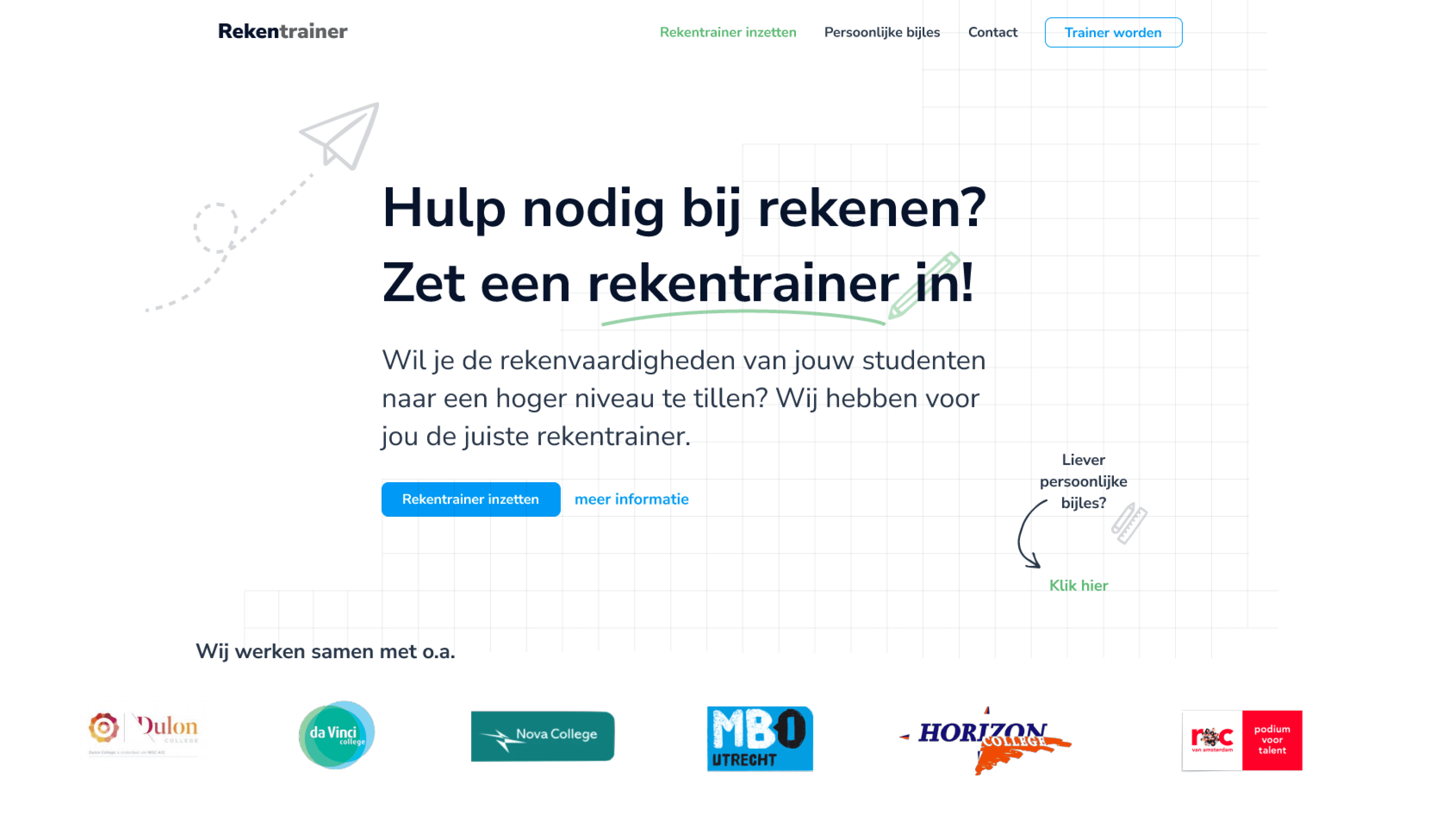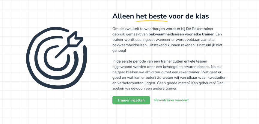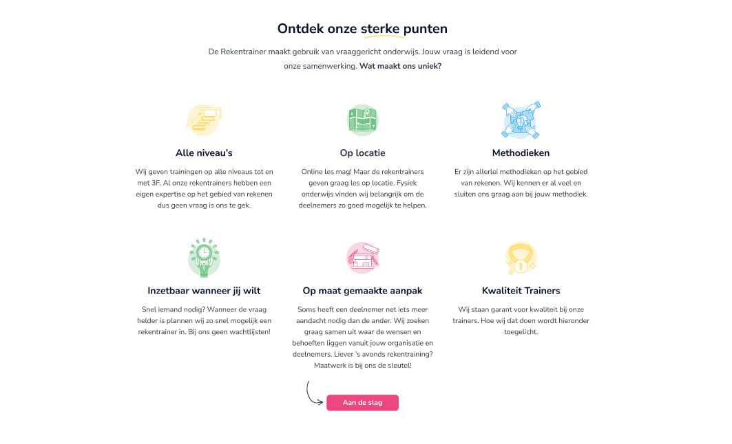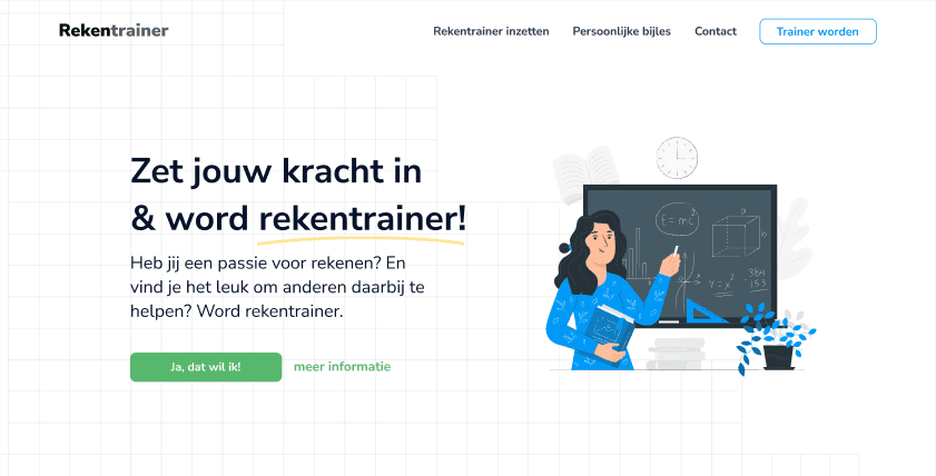 Een professionele, speelse website die de drie verschillende doelgroepen bedient: organisaties die op zoek zijn naar een rekentrainer, mensen die rekentrainer willen worden, en studenten die bijles nodig hebben. Voor alle drie de doelgroepen is het eenvoudig om contact op te nemen.